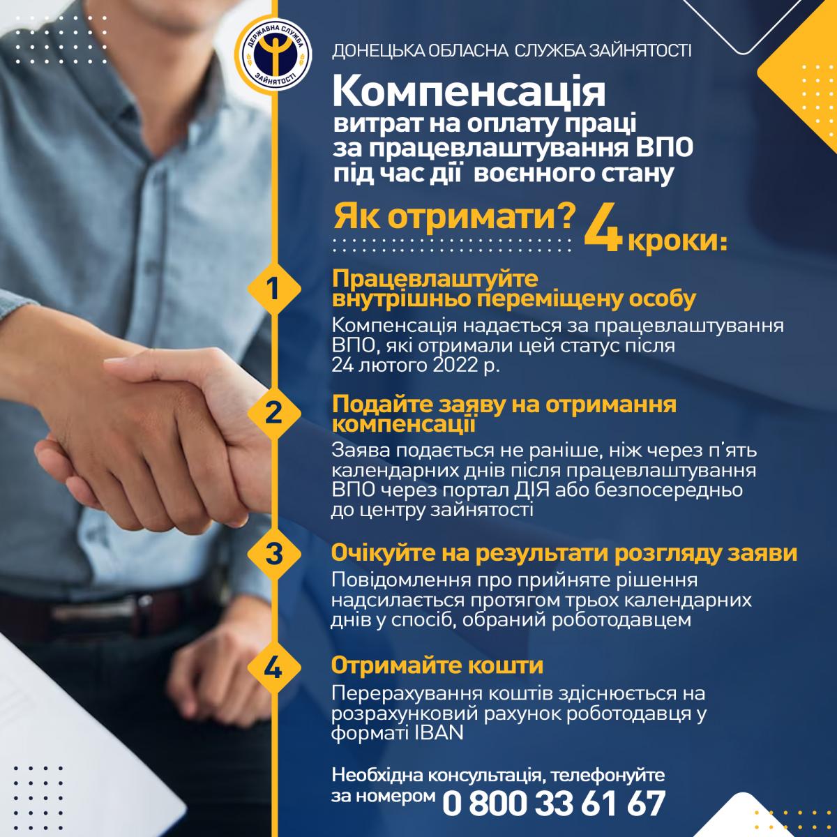 Державна служба зайнятості реалізує активні програми підтримки роботодавців, спрямовані на сприяння у працевлаштуванні внутрішньо переміщених осіб. Одна з них - компенсація витрат на оплату праці за працевлаштування ВПО під час дії воєнного стану.