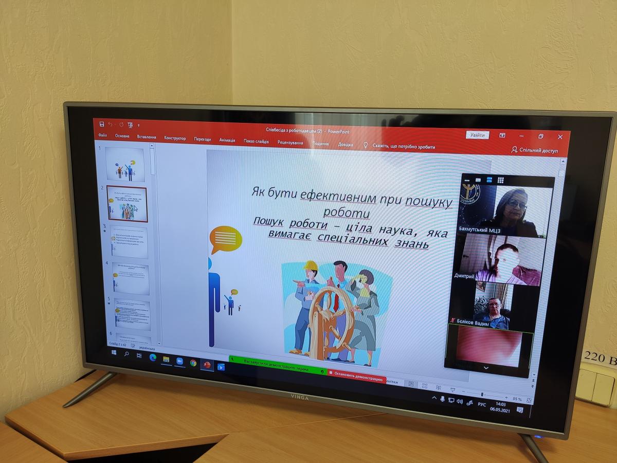 6 травня в центрі дистанційних комунікацій Бахмутського міського центру зайнятості відбувся вебінар для безробітних. Під час заходу було обговорено питання щодо проходження онлайн співбесіди з роботодавцем.