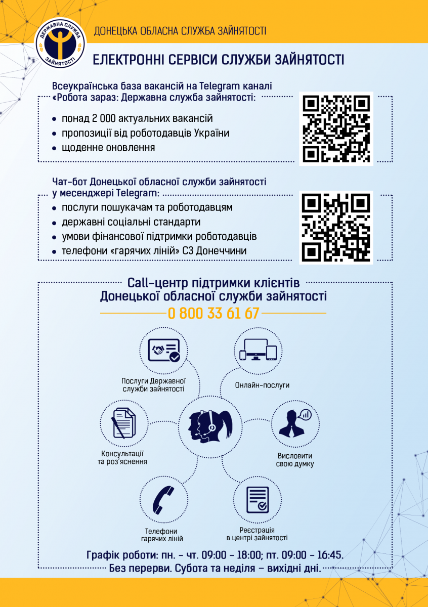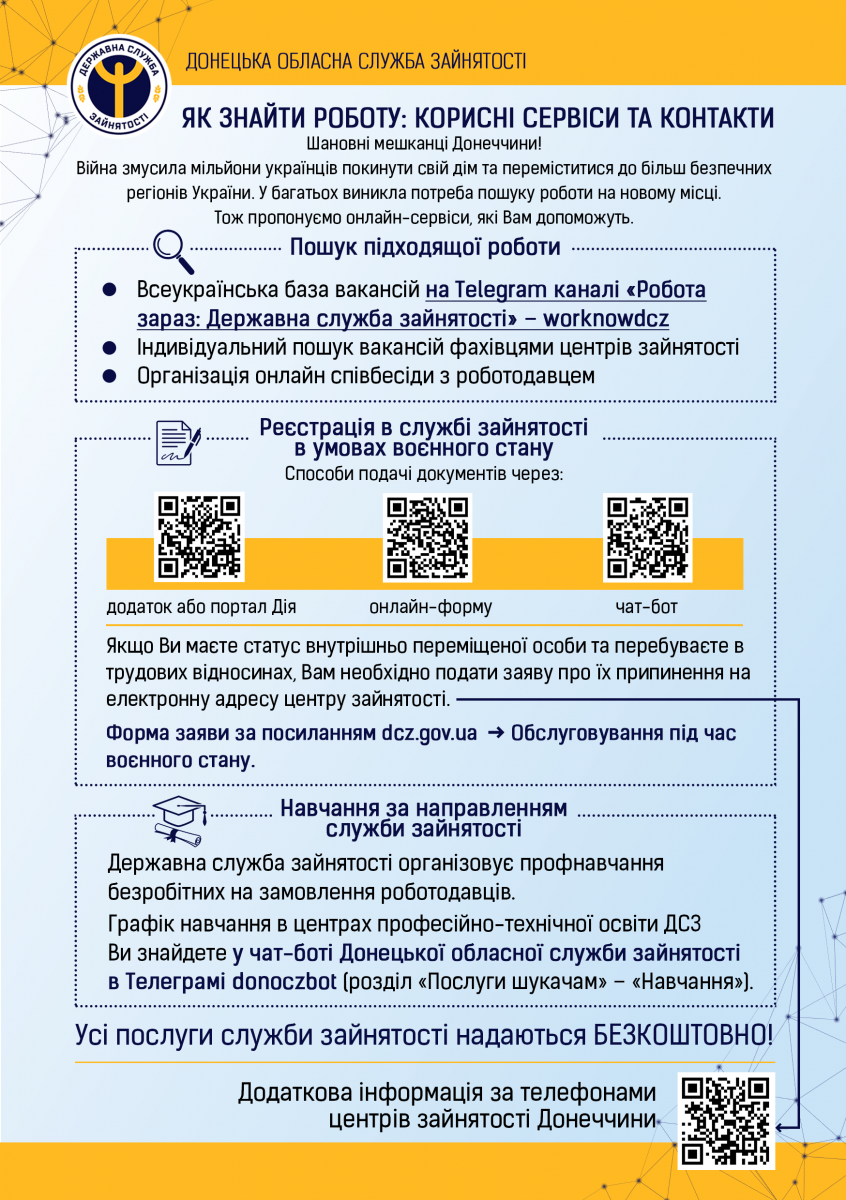 - чат-бот Донецької обласної служби зайнятості у месенджері Telegram - https://bit.ly/3tay5Se