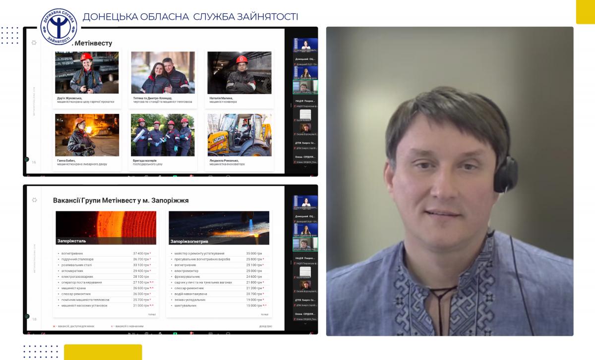 15 травня Донецька обласна служба зайнятості долучилася до Загальнонаціонального ярмарку вакансій (далі — Ярмарок) — масштабного заходу, який одночасно проходив у всіх регіонах країни. Онлайн-формат забезпечив широку участь і зручність — зустрілись роботодавці, громади, освітні заклади та шукачі роботи. Подія об’єднала понад 800 учасників — як місцевих мешканців, так і внутрішньо переміщених осіб, які прагнуть професійного розвитку та шукають нові кар’єрні можливості.