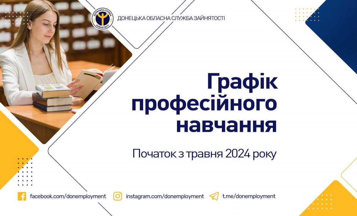 Донецький обласний центр зайнятості інформує про орієнтовний графік на травень 2024 року, за яким планується навчання безробітних у центрах професійно-технічної освіти Державної служби зайнятості.