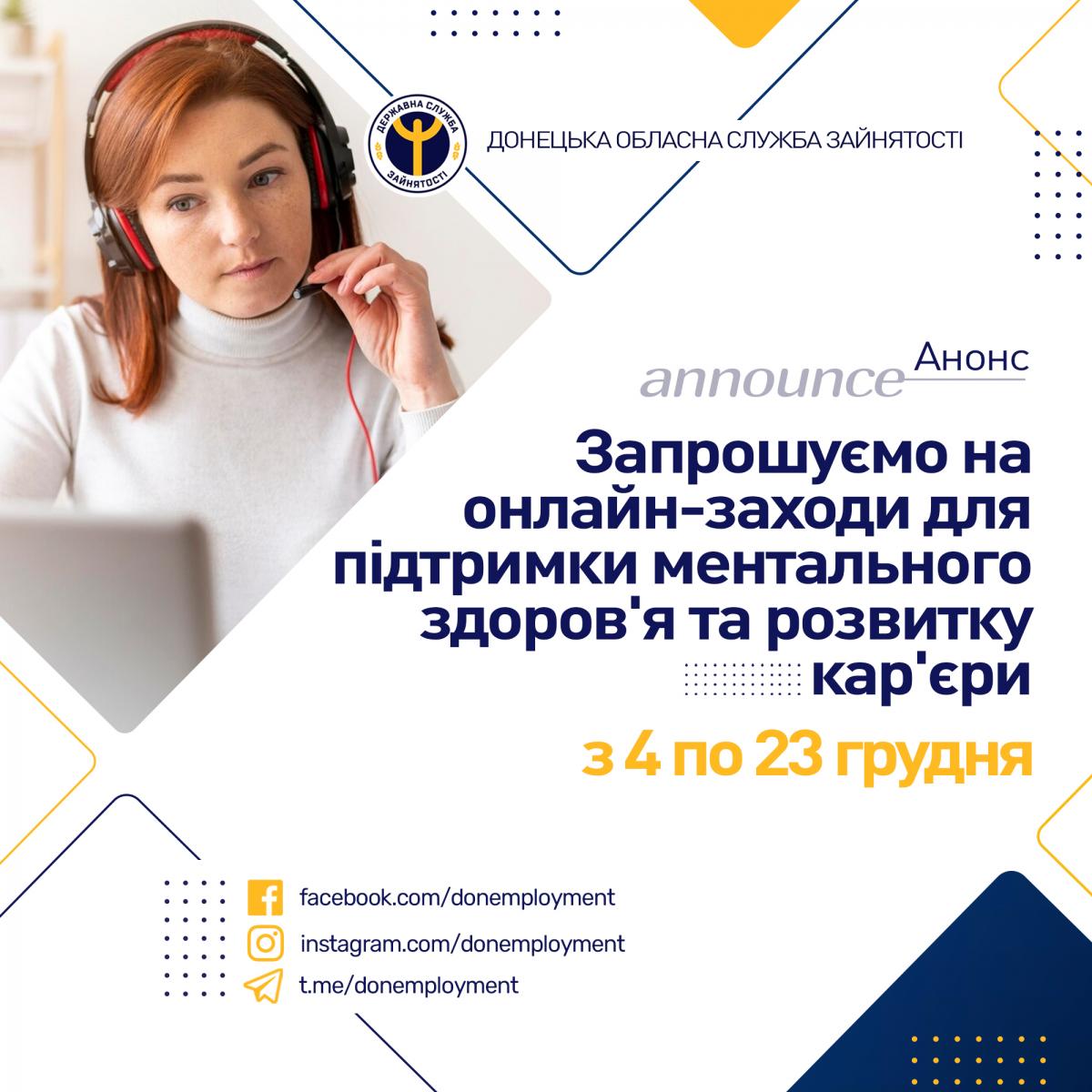 Донецький обласний центр зайнятості спільно з партнерами організовує серію онлайн-зустрічей, присвячених важливим для кожного питанням ментального здоров'я, розвитку кар'єри та безпеки працевлаштування.